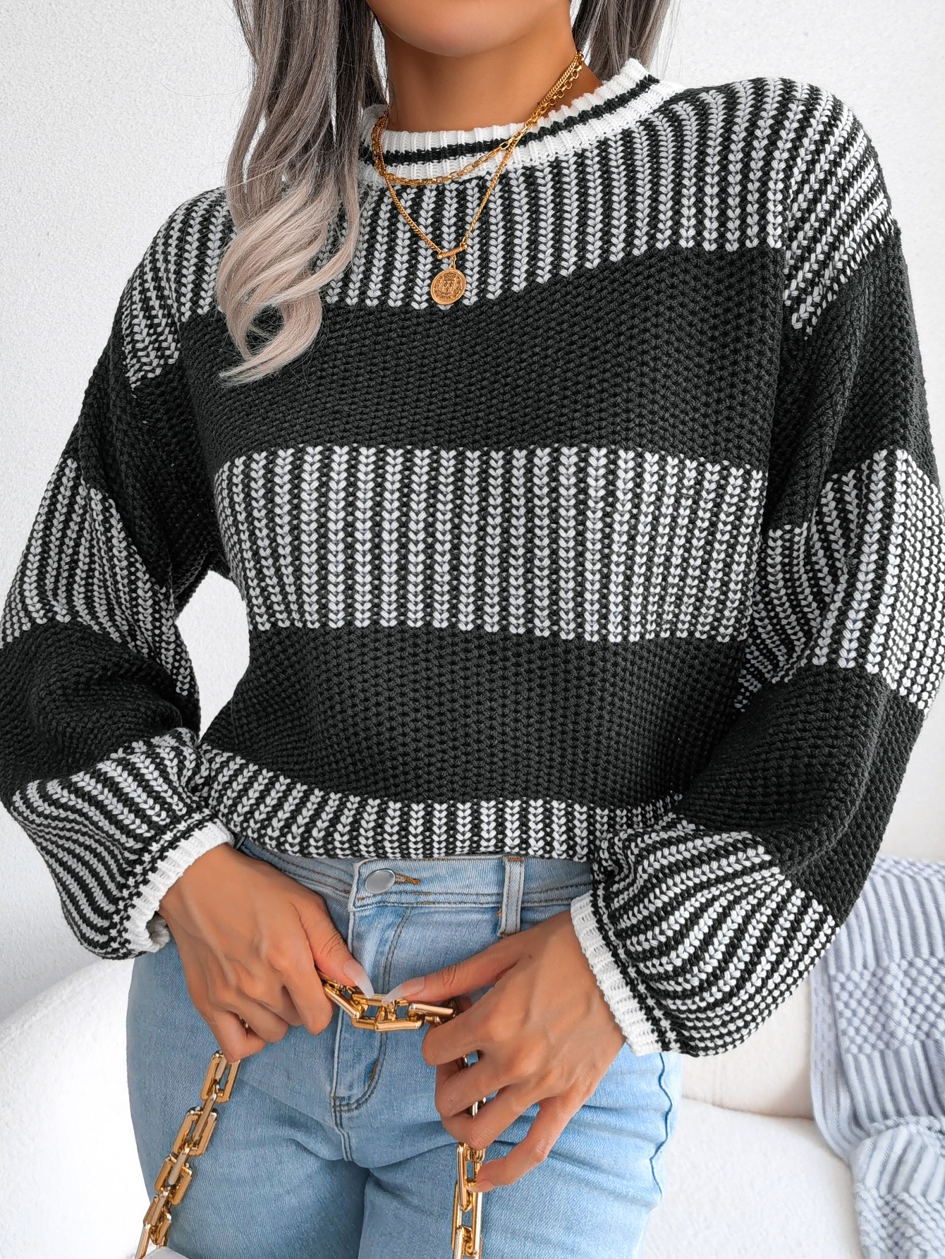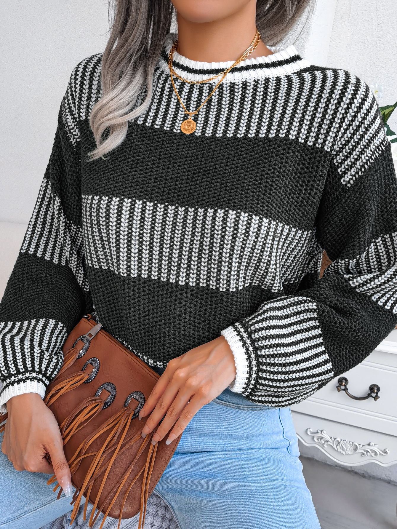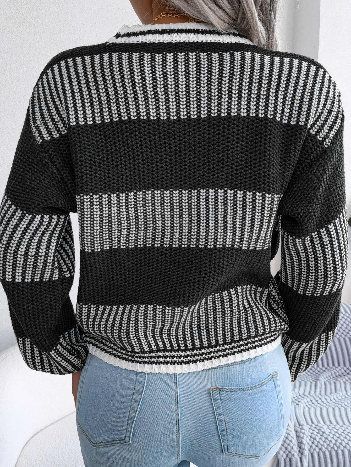 Women Casual Color Block Stripe Long Sleeve Knit Sweater