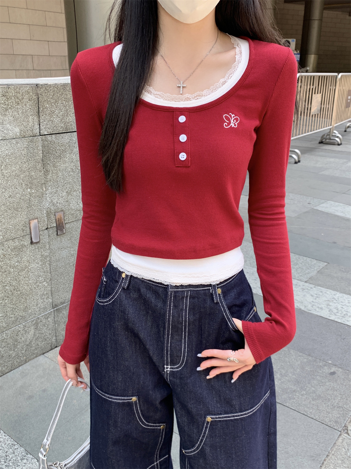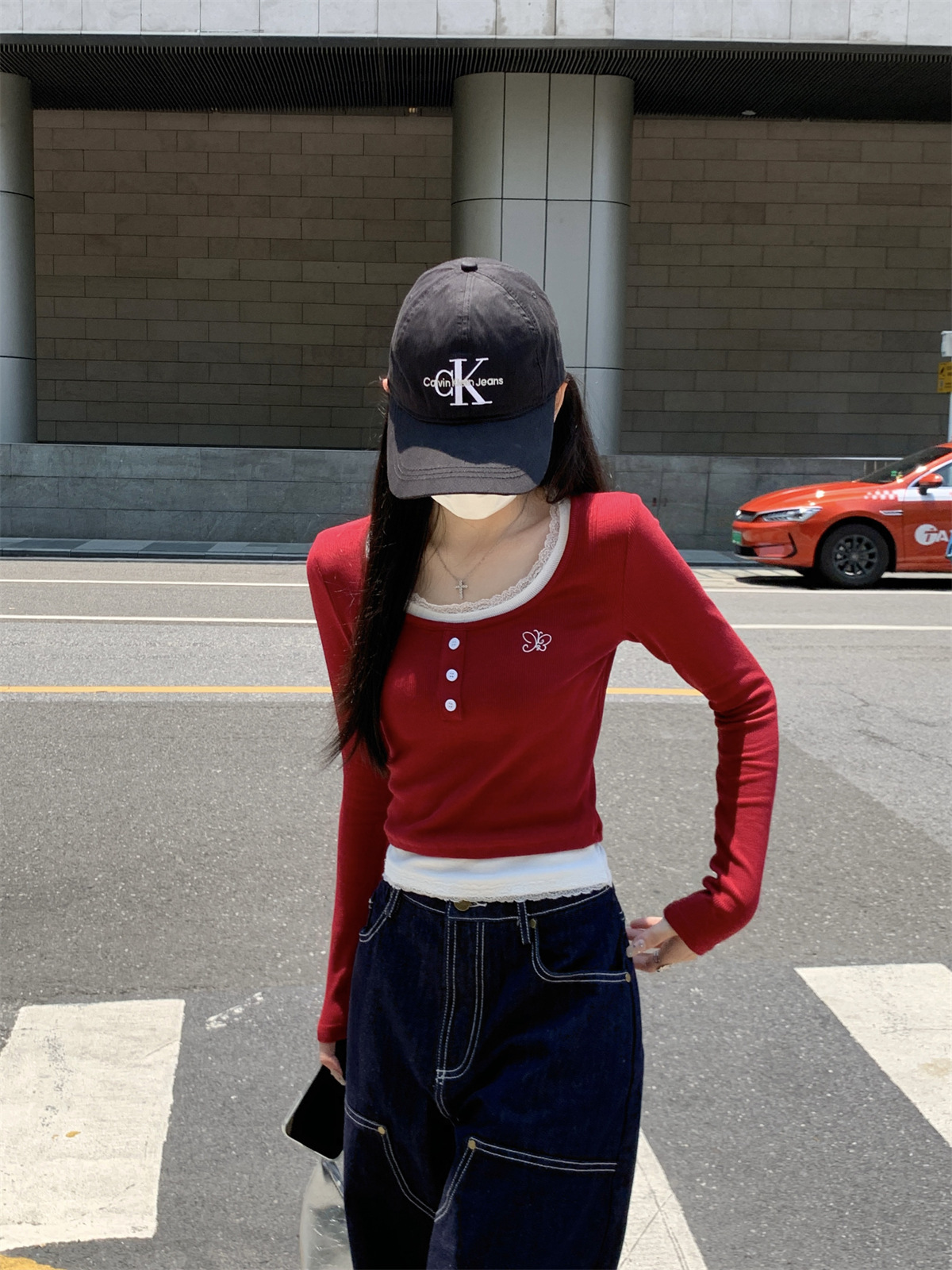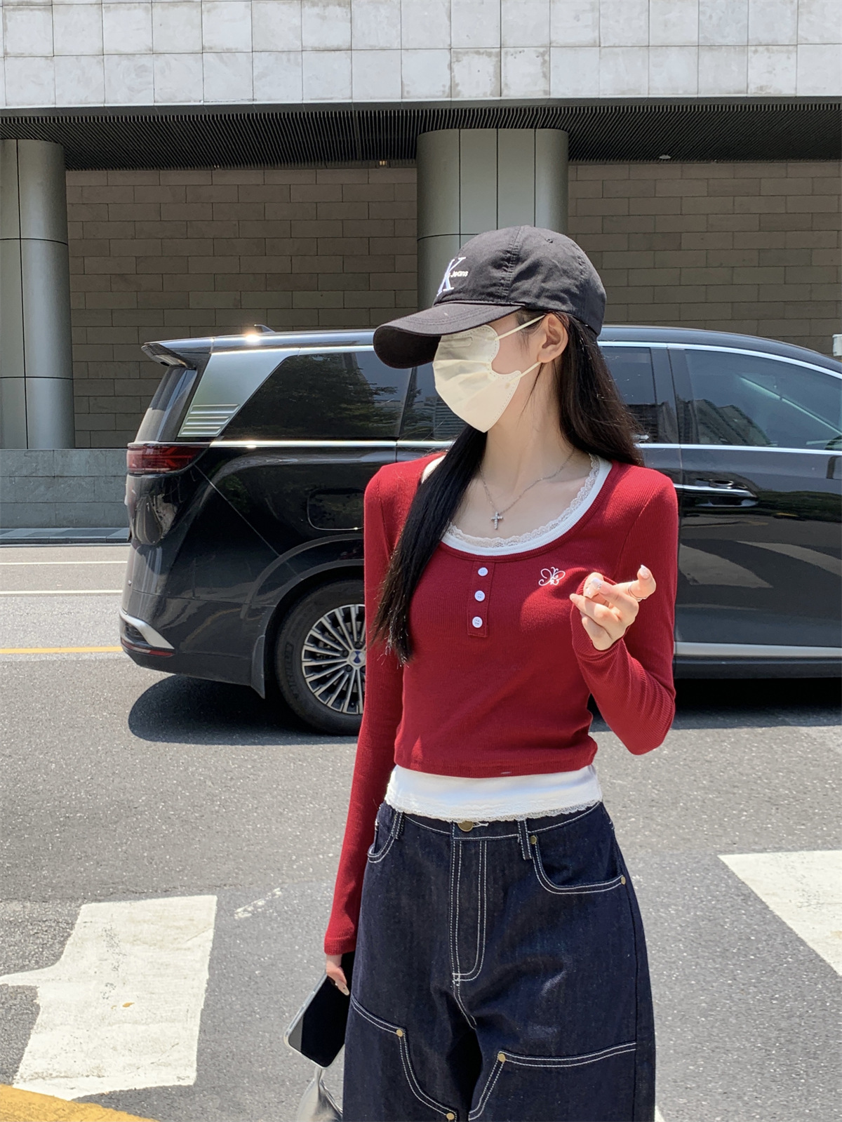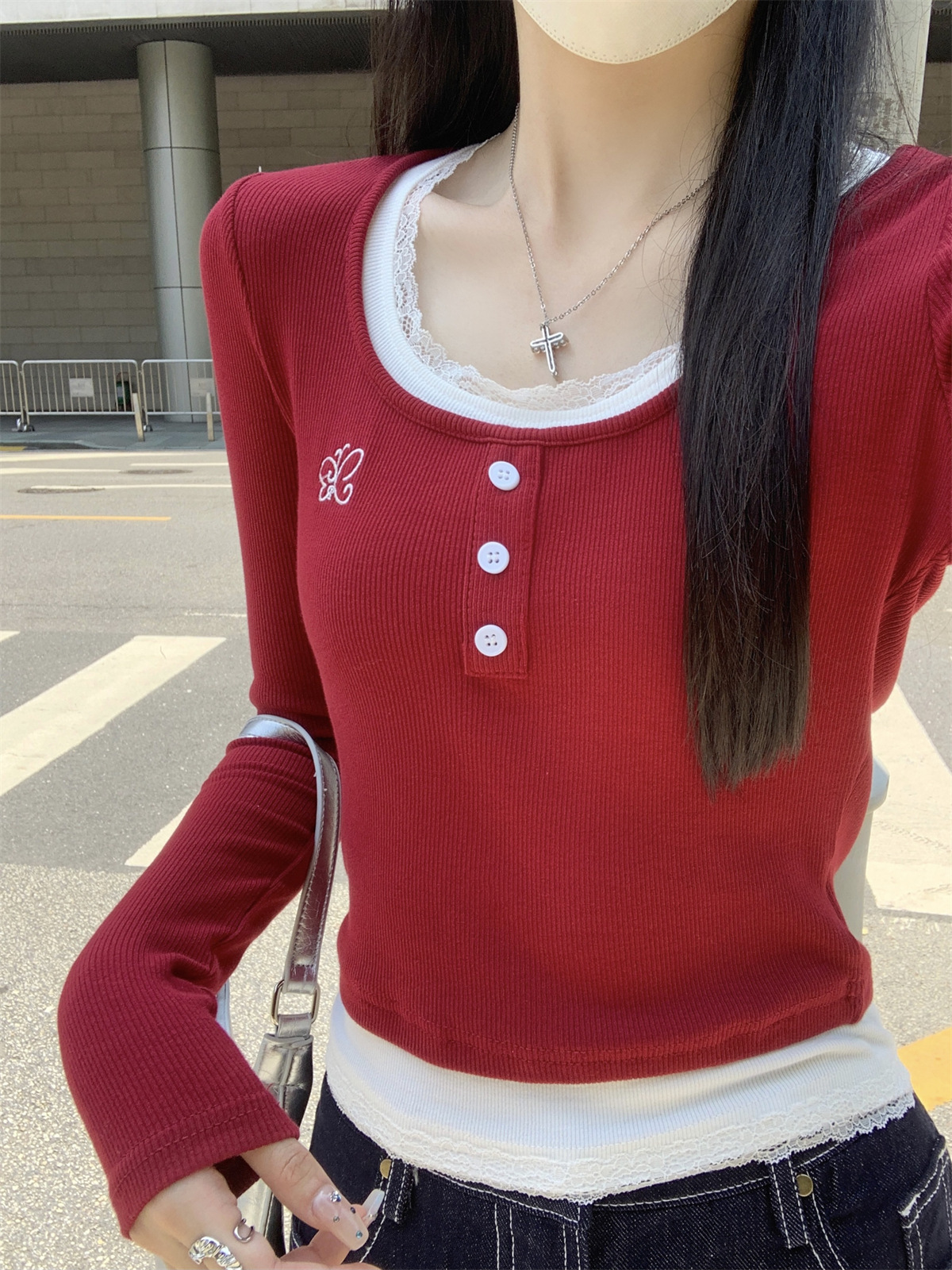 Contrast Color Round Neck Lace Edge Long Sleeve Short Top