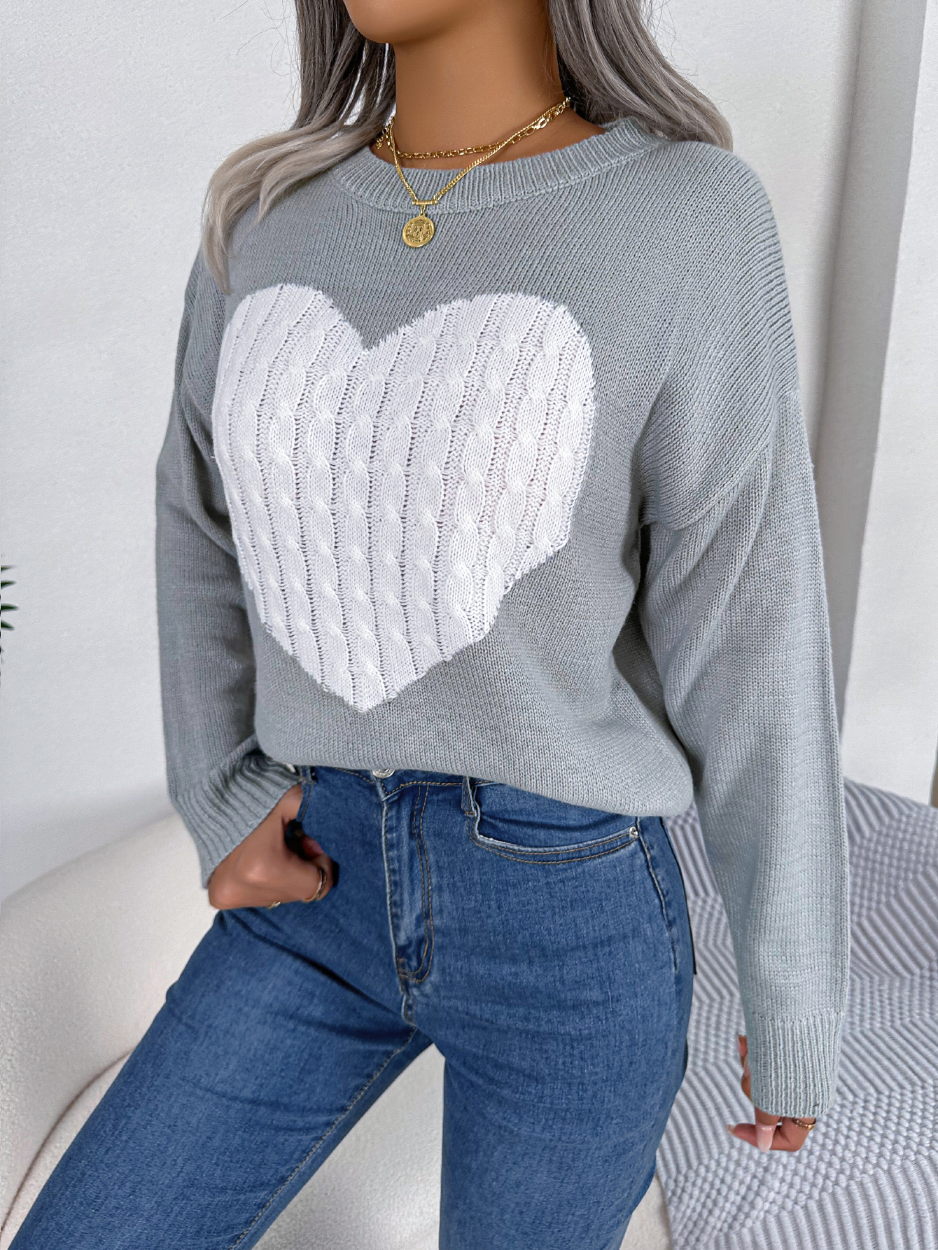 Women Cable Knit Heart Long Sleeve Pullover Sweater